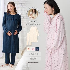 マタニティパジャマ 授乳服 妊婦服 入院着 長袖 春 秋 フリル 前開き 親子コーデ可 綿混 やわらか 産前産後 エンジェリーベ