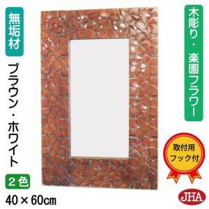 JHAアンティークミラー (デラックス) ウッディ・モダン・木彫りミラー(花柄:楽園フラワー)W400×H600(ブラウン&ホワイト)壁掛け鏡 ウォールミラー バリ島