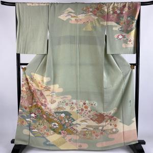 訪問着 身丈165cm 裄丈70cm L 袷 松井青々 落款あり 松 牡丹 金糸 金銀彩 薄緑 正絹 逸品 中古