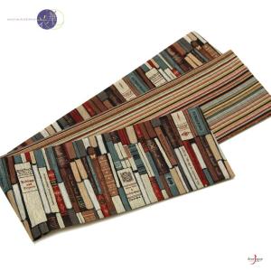 半幅帯 召しませ花 読書の時間 茶色 オレンジ 洋書 本 縞 ストライプ オレンジ 黄色 日本製 リバーシブル 変り結び