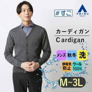 【洋服の青山】ウール100% 毛玉になりにくい カーディガン メンズ 洗える 秋冬用 グレー 灰色 セーター Vネック 洗える 静電気抑制 ビジカジ ビジネス 仕事 男性