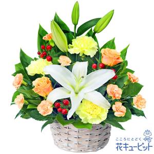 【お祝い】花キューピット 敬老の日 誕生日 記念日 結婚祝い 歓送迎 還暦 開店開業 卒業入学 生花 ユリとオレンジ色のバスケットアレンジメント
