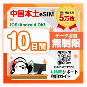 中国(本土)eSIM:使用日数:10日間/データ容量:無制限/China Unicom/簡単設定/有効期限90日/最短即日発行/パスポート番号不要/データ通信専用