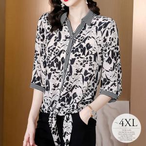 ブラウス シャツ トップス Tシャツ 夏 レディース 大きいサイズ Vネック ボーダー 前縛りデザイン 七分袖 エレガント きれいめ 花柄 ブラック ホワイト お洒落