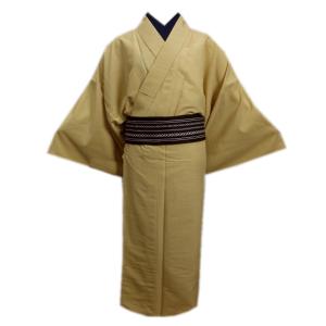 【訳有り 少難あり】 着物 袷 メンズ 男性 お仕立て上がり ワンタッチ角帯 2点セット 薄カラシ黄色 L 洗える 無地