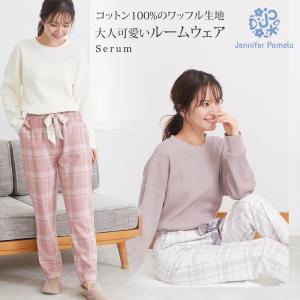 ジェニファーパメラ 綿100% ルームウェア セラム 長袖 上下セット レディース パジャマ ワッフル コットン チェック ピンク 部屋着 セットアップ 春 夏 秋 お…