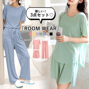 ルームウェア レディース 上下セット 3点セット セットアップ 部屋着 春 夏 黒 半袖 無地 おしゃれ かわいい ロング [郵3]^su087^
