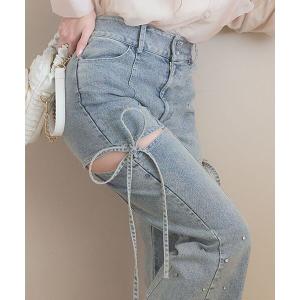 ジーンズ デニム デニムパンツ 「S/Mサイズ展開」サイドカット美脚ビジューデニムパンツ レディース