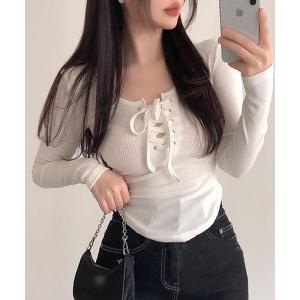 tシャツ スリムアップ スクエアネック レースアップ ロンT/スタイルアップ 韓国 レディース