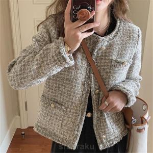 ノーカラージャケット ショート丈 チェック柄 ノーカラー 襟なし きれいめ エレガント 韓国 秋冬 通勤 お出かけ デート レトロ レディース ツイード風