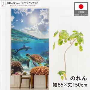 のれん 沖縄 85cm幅 150cm丈 風景 景色 ウミガメとイルカ01 海亀 海中 海 サンゴ 写真風 琉球 ウチナー 暖簾 間仕切り(受注生産 46983)