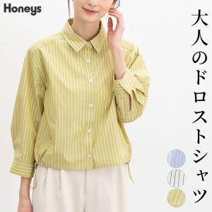 トップス ブラウス シャツ 裾ドロストシャツ 裾ドロスト ストライプ柄 綿 SALE Honeys ハニーズ 8分袖裾ドロストシャツ