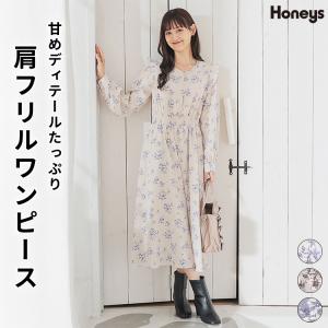 ワンピース フリルワンピース 長袖 ロング丈 大きいサイズ 肩フリル 花柄 Vネック ウエストゴム 裏地付き レディース Honeys ハニーズ 肩フリルワンピース