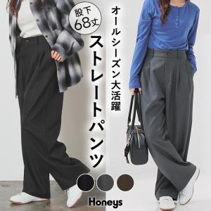 ボトムス パンツ ロングパンツ 股下68cm 再生ポリエステル ハイウエスト ツイル素材 無地 レディース Honeys ハニーズ ストレートパンツ(股下68cm)
