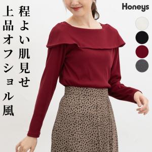 トップス カットソー 長袖 オフィス きれいめ オフショル風 ストレッチ テレコ素材 レーヨン混 無地 ケープ レディース Honeys ハニーズ オフショル風トップス