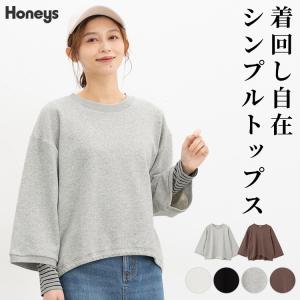 トップス スウェット スウェットトップス クルーネック 無地 綿混 裏毛 カジュアル 秋 白 黒 レディース Honeys ハニーズ 8分袖スウェットトップス