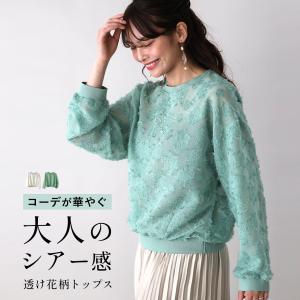 トップス 花柄 シアー プルオーバー シアートップス ブラウス 花柄レース 華やぐ ホワイト グリーン white green 白 緑 長袖 薄手 お洒落