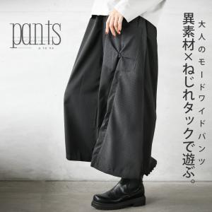 パンツ ボトムス 異素材×ねじれタックで遊ぶ大人のモードワイドパンツ リブ 無地 ロング丈 ワイド ゆったり ブラック 春 秋 秋冬 OTONA 40代 50代 60代