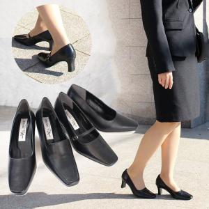 スクエアトゥ Vカット パンプス レディース 歩きやすい ローヒール 黒 amiamiアミアミ