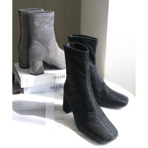 ブーツ ラメ素材スクエアトゥ ストレッチショートブーツ レディース