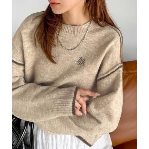ニット セーター 「mily bilet」シンプルながらも個性が引き立つ。アウトリンキング胸刺繍ミックスニット レディース