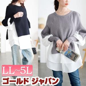 大きいサイズ レディース チュニック ニット シャツ ドッキング レイヤード風 異素材 切替え 無地 冬コーデ 春 秋 F フリー LL 2L 3L 4L 5L ブラック グレー