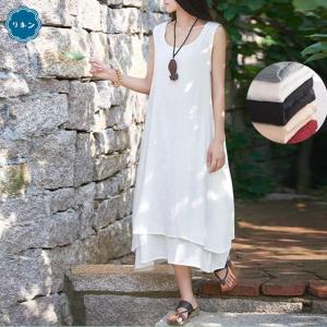 春物新作 コットン リネン サマーワンピース マキシ ロング丈 Aライン ドレープ ドッキング 2重素材 ダブル素材 ノースリ レディース 綿 麻 春 夏 秋 スラブ ナ