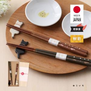 夫婦箸 結婚祝い | 乾漆花見猫 箸置きセット 食洗機対応 若狭塗 日本製 | ネコ ねこ 猫柄 ペア めおと箸 お祝い プレゼント ギフト 贈り物 猫好き メール便