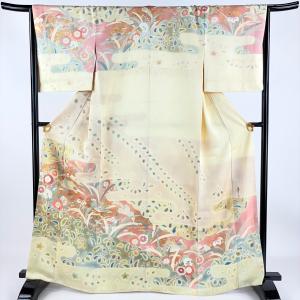 訪問着 身丈167cm 裄丈65.5cm M 袷 松井青々 落款あり 菊 鳥 金糸 刺繍 薄黄 正絹 逸品 中古