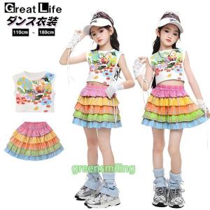 キッズ ダンス衣装 セットアップ 白 花柄 虹色 縞柄 タンクトップ スカート 女の子 jazz 韓国k-pop プリンセスふわふわサリー へそ出し ショー
