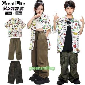 総柄 カーキグリーン キッズ ダンス衣装 セットアップ おしゃれ 半袖 女の子 へそ出し 男の子 かっこいい カジュアルシャツ シャツ へそ出し トップス カー