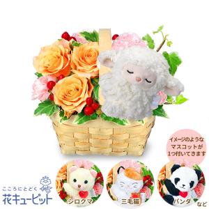 【結婚記念日】花キューピット 夫婦 祖父母 一周年 花婚式 銀婚式 金婚式 ギフト プレゼント オレンジバラのマスコット付きウッドバスケット
