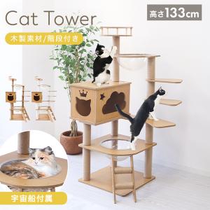 キャットタワー 木製 宇宙船 据え置き 大型猫用 キャットウォーク 猫タワー 階段 スリム 短足猫 滑り止め シニア猫 子猫 多頭飼い 高さ133cm 爪とぎ 麻