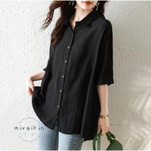 黒シャツ レディーストップス 夏服 五分袖 前開き 羽織り 夏ブラウス 夏シャツ 40代着痩せ 黒 30代上品 麻 50代コーデ 前後差 チュニック丈 ドロップショルダー