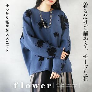 トップス 着るだけで華やぐモードな花 ゆったり軽やか大人ニット 長袖 柄 チクチクしない 大きいサイズ ブルー OTONA 40代 50代 60代