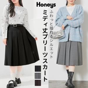 ボトムス スカート ひざ丈 プリーツスカート ストレッチ ツイル素材 無地 ウエストゴム ひざ下丈 レディース Honeys ハニーズ ミディ丈プリーツスカート