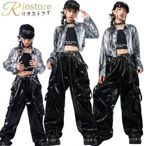 k-pop 衣装 ダンス 衣装 キラキラ シルバー 黒 レザー キッズ ダンス衣装 セットアップ 女の子 子供服 インナー 長袖 ズボン 演出服 練習着 韓国 ジャズダンス H