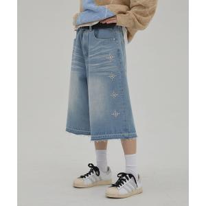 ジーンズ デニム デニムパンツ K-POPアイドル着用「UNISEX」Wai Kei/STUDバミューダパンツ レディース メンズ