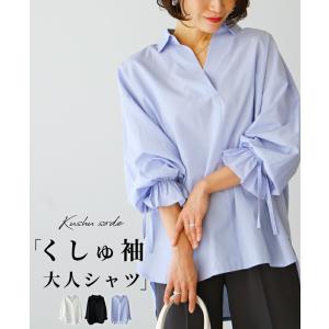 ブラウス レディース Vネック ストライプ スキッパーシャツ ブラック 体型カバー くしゅ袖 シャツ 白 黒 コットン きれいめ 上品