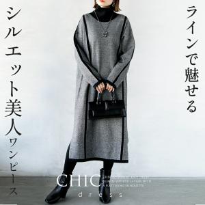 ニットワンピース ラインで魅せるシルエット美人ワンピース ニット ワンピース モノトーン ブラック 秋冬 長袖 ハイネックOTONA 40代 50代 60代