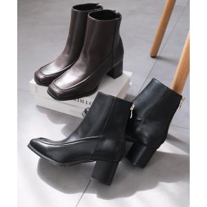 ブーツ 「5cmミドルヒールVer.」スクエアトゥプレートヒールショートブーツ レディース