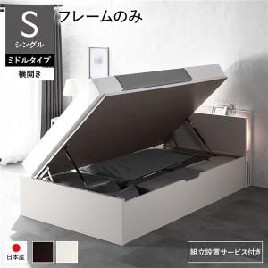 〔組立設置サービス付き〕 日本製 収納ベッド 通常丈 シングル フレームのみ 横開き ミドルタイプ 深さ37cm ホワイト 跳ね上げ式 照明付き