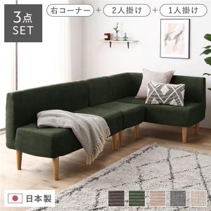 日本製 ダイニングソファ 3点セット 右コーナー+2人掛け+1人掛け コーデュロイモスグリーン ナチュラル脚 ポケットコイル