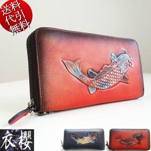 2023年夏新作 衣櫻/ころもざくら カラフル鯉 型押し 牛革レザー 天然皮革 ストラップ 和柄 ラウンドZIP長財布 ロングウォレット 赤/黒:F(フリー) SA1554