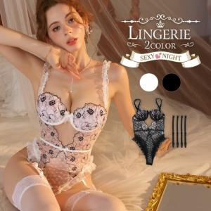 セクシーランジェリー テディ スリーインワン ガーターベルト 白 黒 セクシー下着 シースルー フラワーレース 大人 レディース
