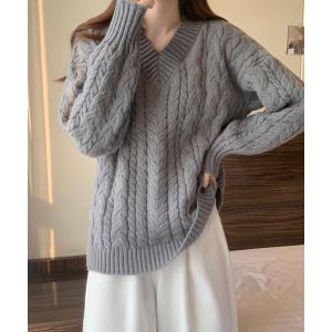 ニット セーター Vネック ケーブル編みニット オーバーサイズ リブニット レディース