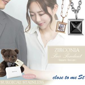 ペアネックレス ブランド 刻印 テディベア付 一粒 スクエア サージカルステンレス close to me お揃い カップル プレゼント
