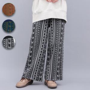 キカ柄ニットパンツ / イージーパンツ ロングパンツ ウエストゴム ニット ジャカード 幾何学柄 総柄 ワイド 洗濯機で洗える 伸びる 楽ちん ブラック キャメル