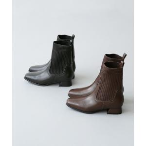 ブーツ スクエアトゥ リブニット デザインヒール ブーツ レディース