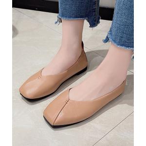 パンプス スクエアトゥ レザー調 ローヒール ステッチ パンプス